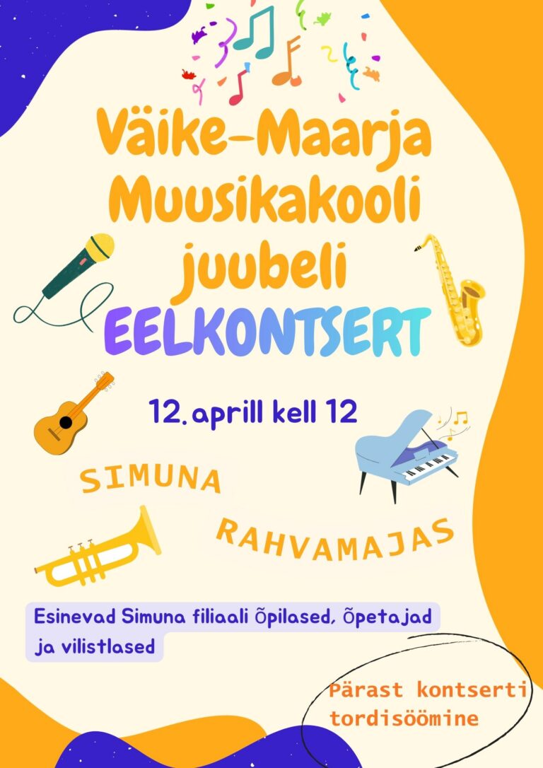26.02.2026 Kontsertid Väike-Maarja Muusikakooli juubeli eelkontsert Simuna Rahvamajas Väike-Maarja Muusikakooli juubeli teine eelkontsert toimub Simuna Rahvamajas 12. aprill kell 12. Esinevad Simuna filiaali õpilased, õpetajad ja vilistlased.